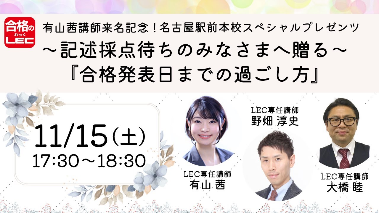 【動画】有山・野畑・大橋講師の「有山茜講師来名記念!LEC名古屋本校スペシャルプレゼンツ~記述採点待ちのみなさまへ贈る『合格発表日までの過ごし方』」