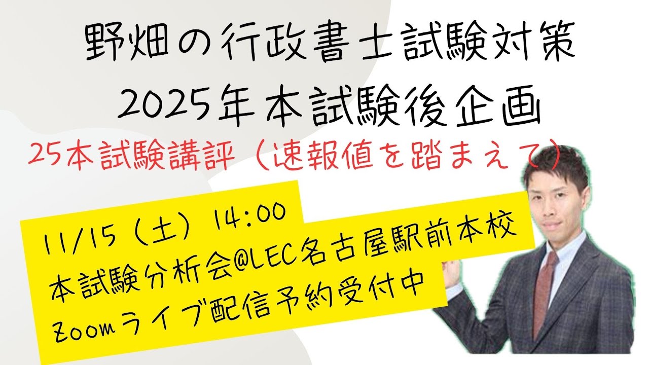 【動画】<11/14(金)19:00~>2025(令和7)年度 行政書士 本試験分析会 2日目