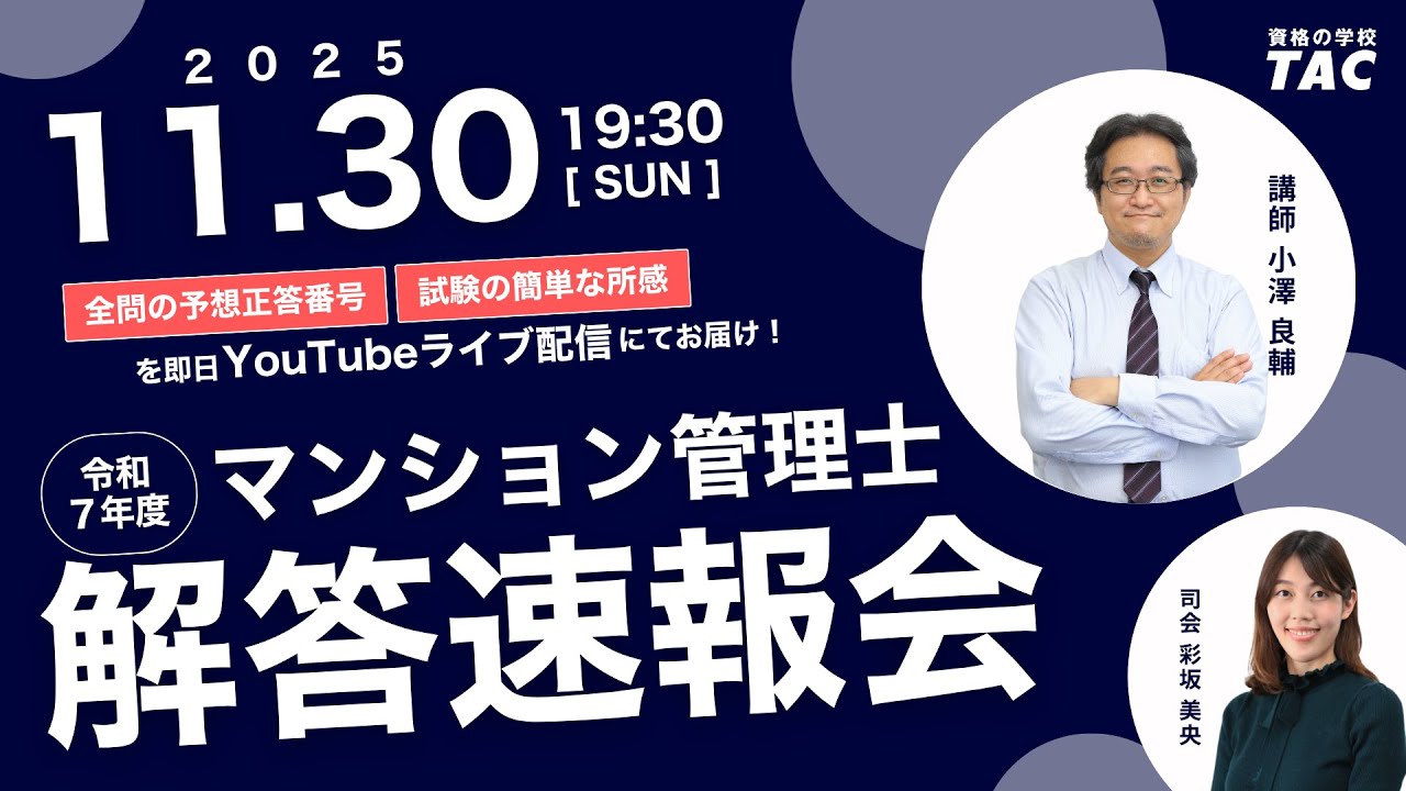 資格の学校TAC・マンション管理士講座では試験日当日に解答速報を公開する予定です。また令和7年度本試験の詳細な解説が入った「『解答解説』無料Web閲覧サービス」も実施します。TAC解答速報はこちら