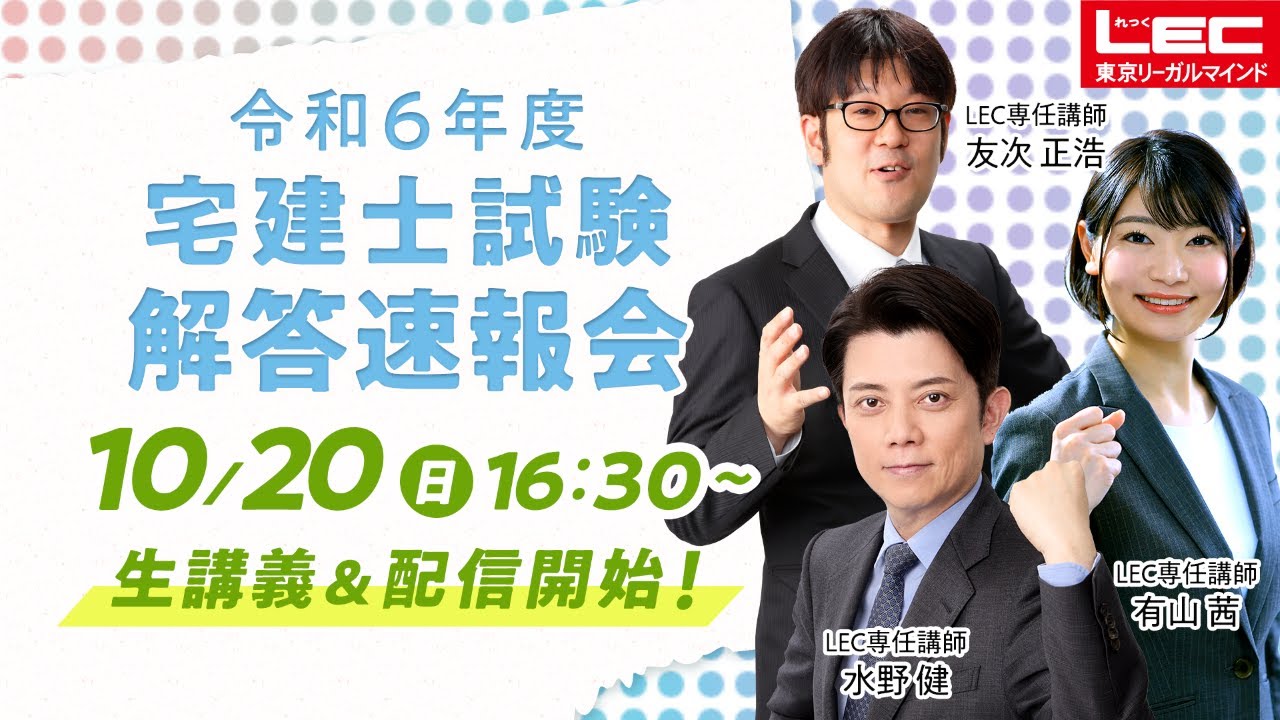 令和7年度宅建士試験の解答速報・合格推定点など、最新情報を順次お伝えいたします。10月19日(日)16:30~ LEC新宿エルタワー本校よりライブ配信開始!